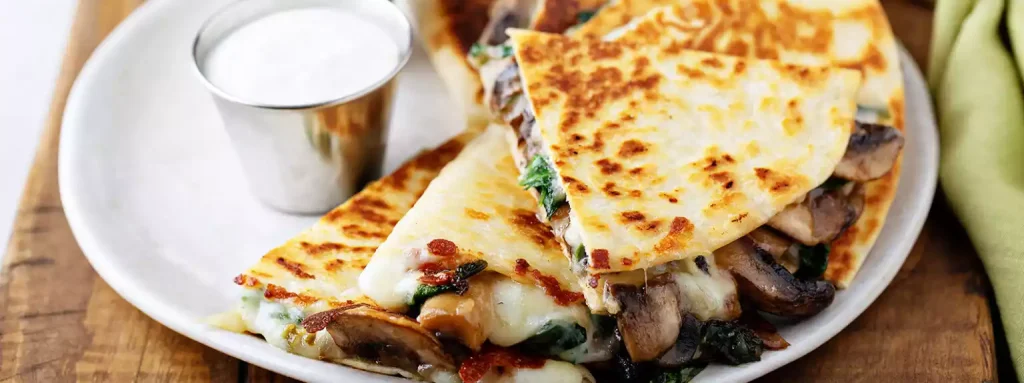 - Place a tortilla in the pan, sprinkle with mozzarella cheese, and add the mushroom-spinach mixture.